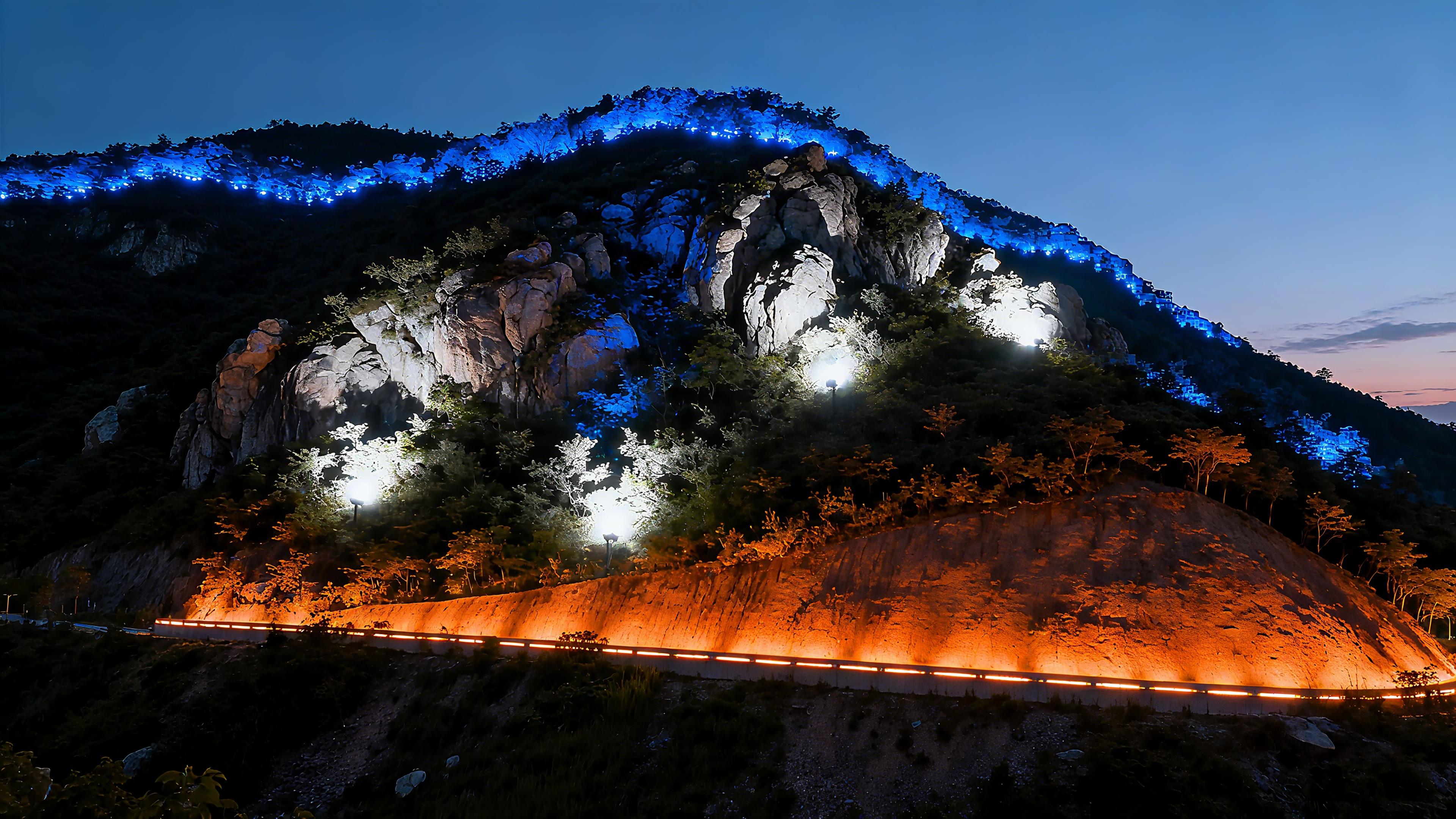 在濟(jì)南老虎洞山隧道周邊山體亮化工程中,公司充分考慮山體與交通設(shè)施的協(xié)同性,設(shè)計(jì)三級光照模式:隧道出入口山體采用柔和過渡光,避免強(qiáng)光對行車視線的干擾;登山步道沿線設(shè)置防眩光路燈,構(gòu)建夜間 "安全紐帶";而山頂觀景臺區(qū)域則通過投光技術(shù)凸顯巖石紋理,形成層次分明的夜間景觀。這種 "功能優(yōu)先、景觀為輔" 的設(shè)計(jì)思路,完美平衡了交通安全與觀賞需求。